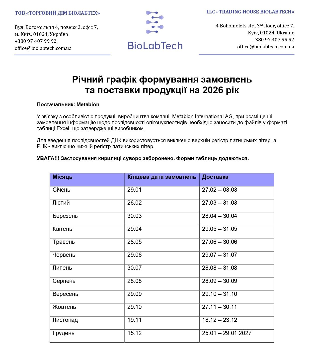 Публікуємо графік прийому замовлень на продукцію Metabion на 2026 рік, щоб ви могли завчасно спланувати закупівлі та безперебійно отримувати необхідні олігонуклеотиди й реагенти.