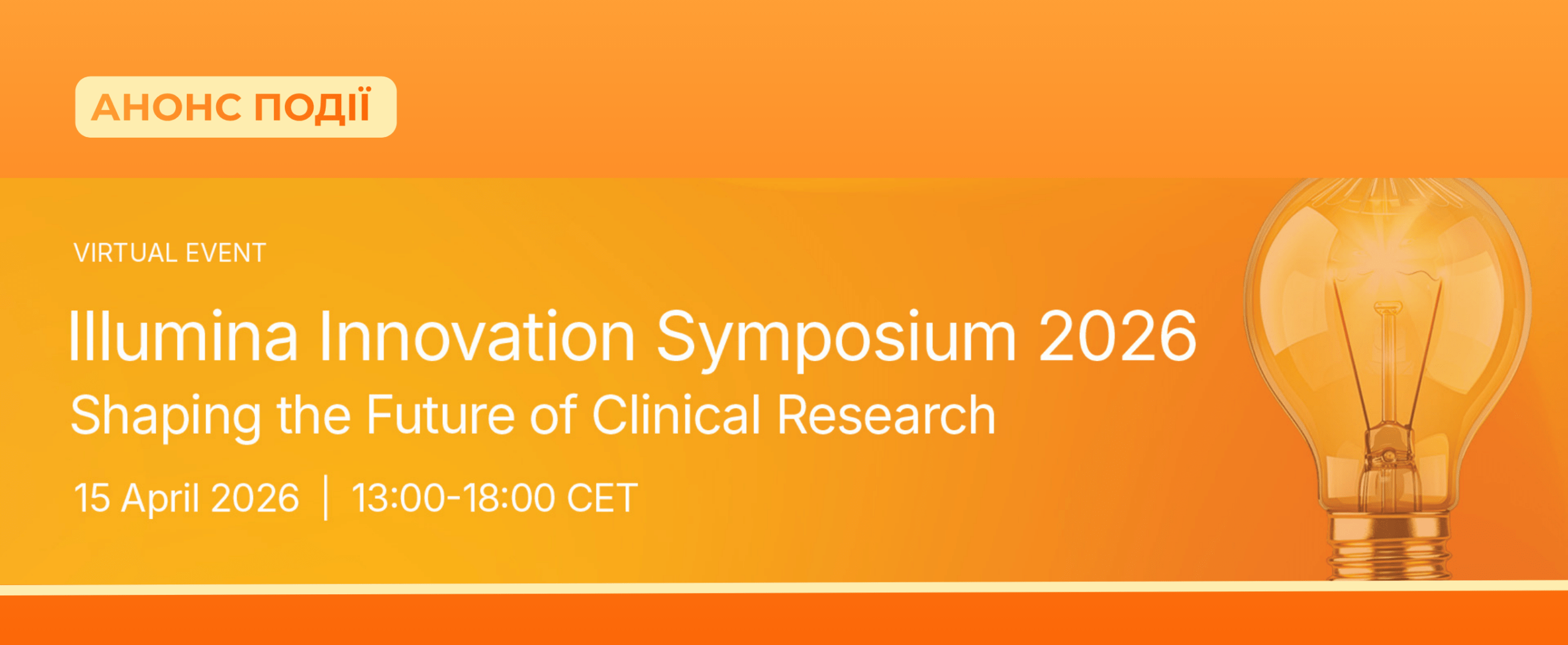 Запрошуємо вас долучитися до віртуального заходу Illumina Innovation Symposium: Shaping the Future of Clinical Research, який відбудеться 15 квітня 2026 року.
