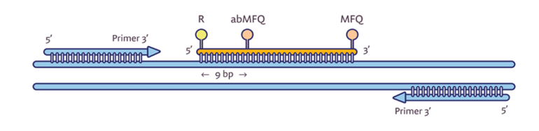 HP Double Quenched Probes використовують високоефективний внутрішній гасник abMFQ, що дозволяє зменшити фоновий сигнал до чотирьох разів порівняно з стандартними зондами з подвійною міткою та підвищити кінцеву флуоресценцію.
