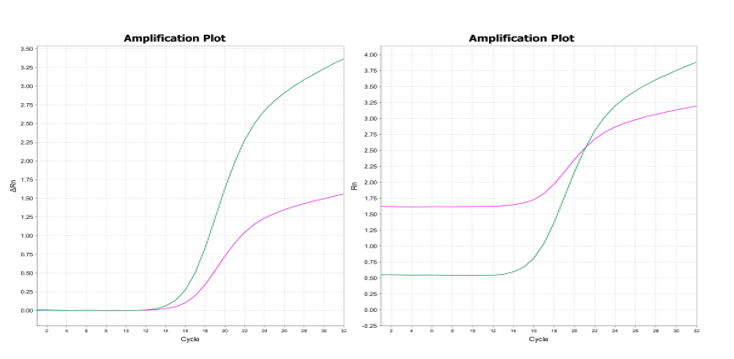 (А) Збільшення амплітуди сигналу HP DQP (FAM-abMFQ-MFQ, зелений) порівняно з еквівалентним зондом з одинарним гасником FAM-BHQ®-1 (рожевий).